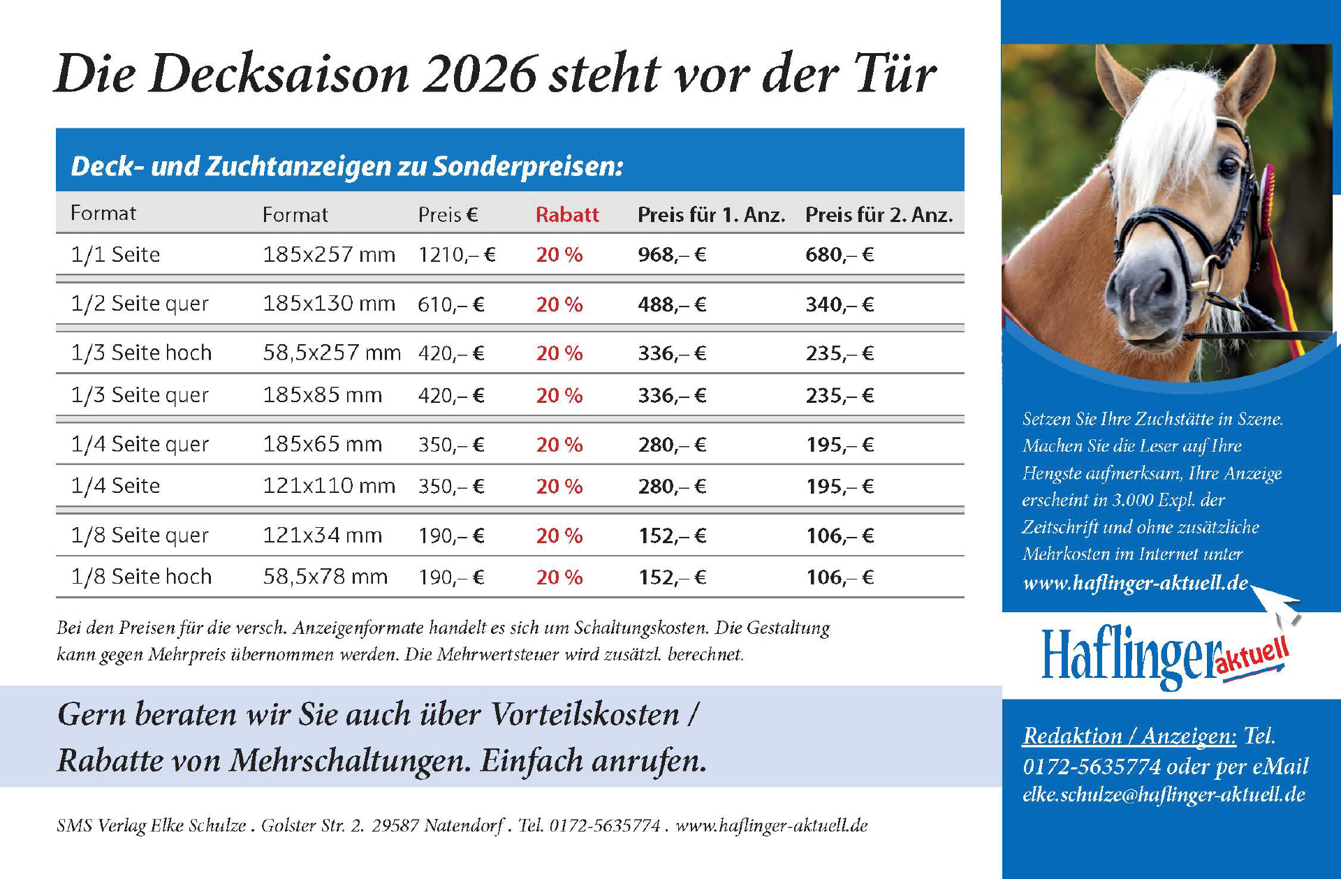 Die Decksaison 2026 steht vor der Tür! Nutzen Sie die Gelegenheit und präsentieren Sie Ihre Hengste in der Märzausgabe von Haflinger aktuell – der perfekten Plattform, um Züchterinnen und Züchter zielgerichtet zu erreichen.